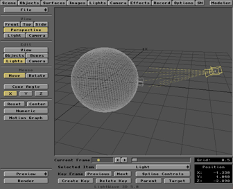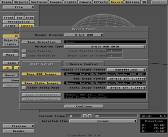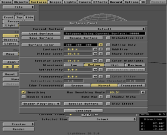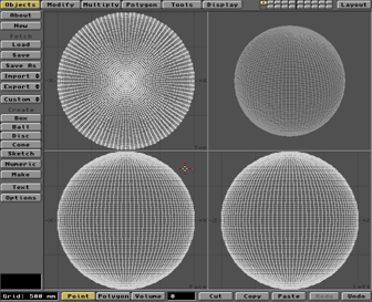 At first glance the Modeler seems a bit spartan. This is where all mesh editing is done and I expected to see a little more. However, the buttons along the top switch in different panels on the left. Several buttons also conceal pop-up windows. There's a lot more going on here. I clicked the button conveniently named Ball and drew out a square in the top and side views with Ctrl-Click-Drag. The Numeric button pops up a window to set the number of sides and vertical segments. I set these to 100 to get a reasonably spherical mesh. I could not find an option for non-polygonal spheres. Our brief stop by the Modeler is complete. The object can now be saved out for loading into the Layout program. Layout
